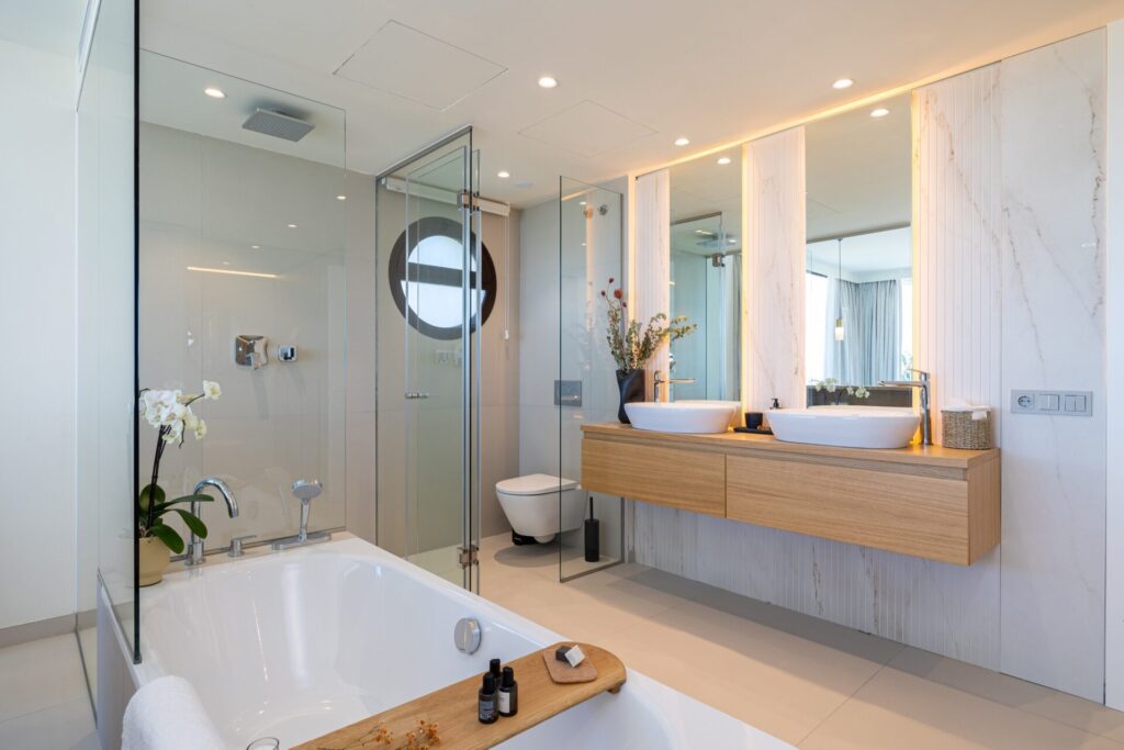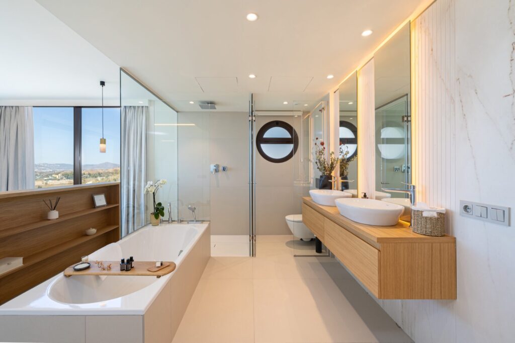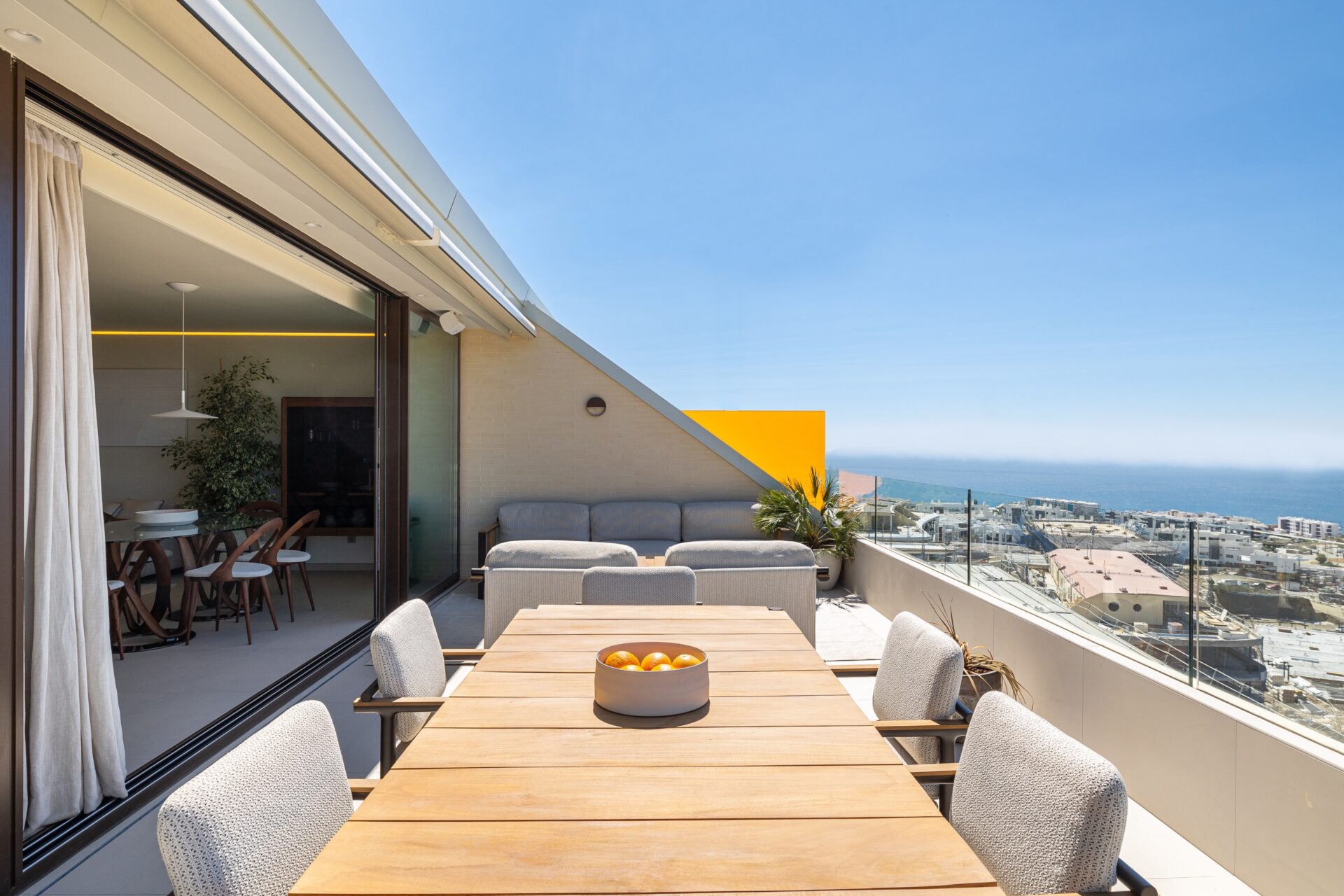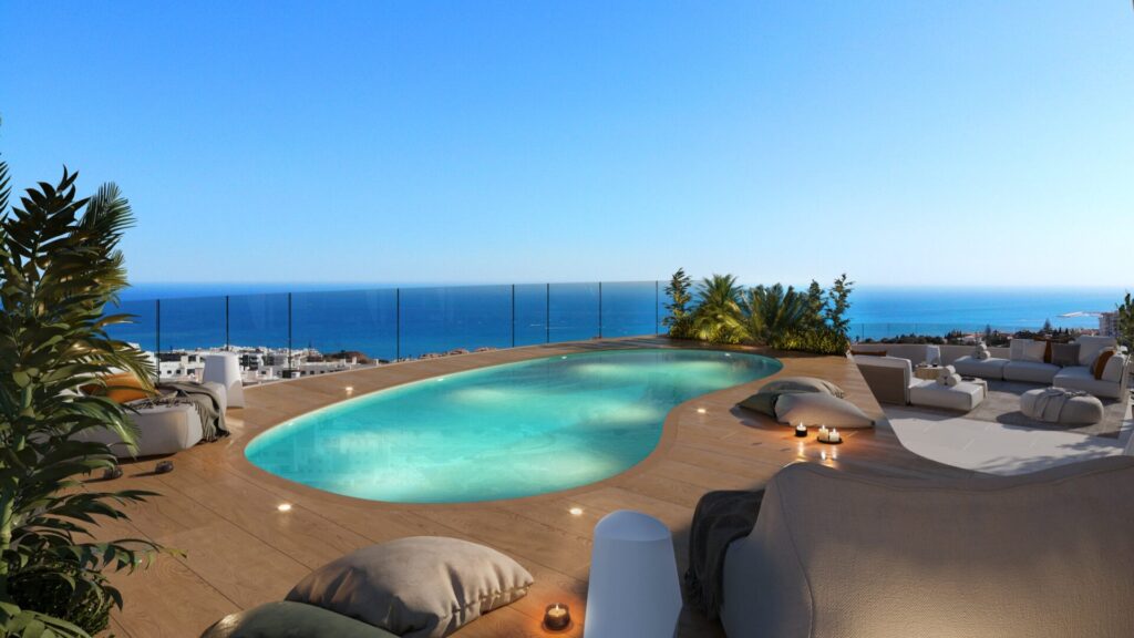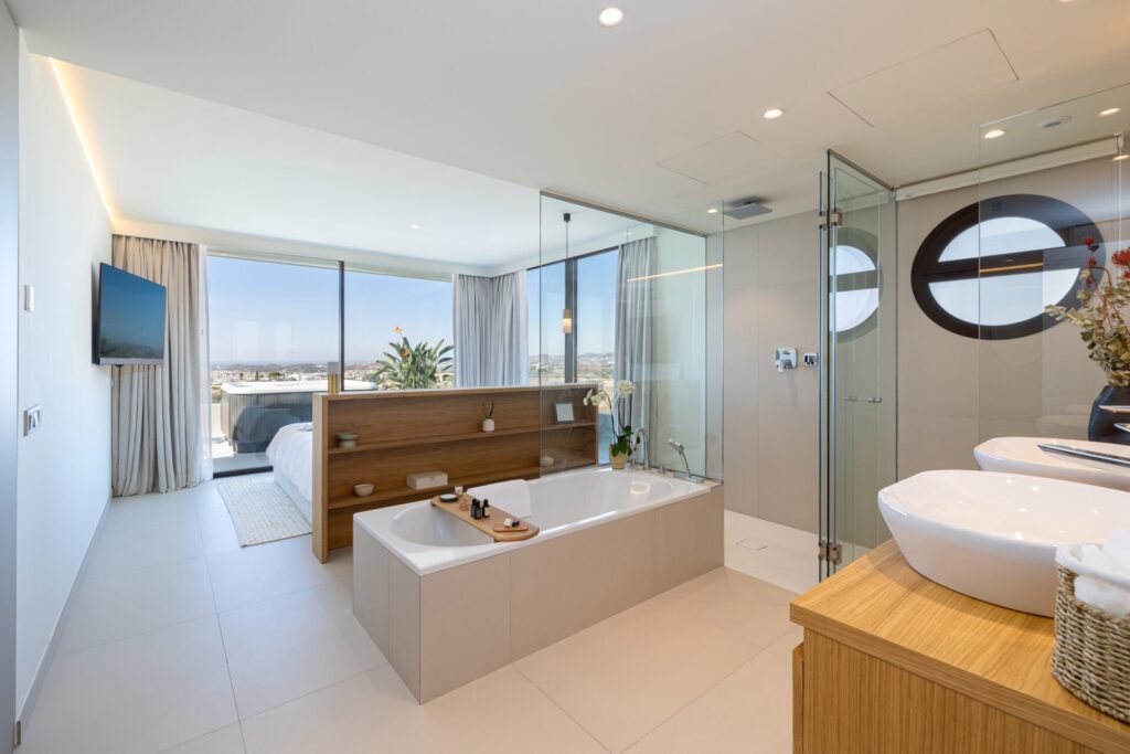 El ático incorpora terraza con jacuzzi privado y solárium, concebidos como una prolongación natural del interior y pensados para el disfrute del clima mediterráneo con privacidad.